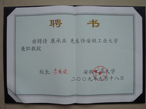 聘任仪式上,岑豫皖校长称赞康承业先生具有丰富的学识和企业管理经验,具有较高的学术水平,同时还具有较强的管理创新与组织变革能力,受到了一些著名大学教授和学术机构专家的好评,是一位学者型的优秀企业家。安徽工业大学经认真评估后聘任康承业先生担任兼职教授,必将提高学校的学术研究水平,也会大大增强学校产、学、研一体化的能力。