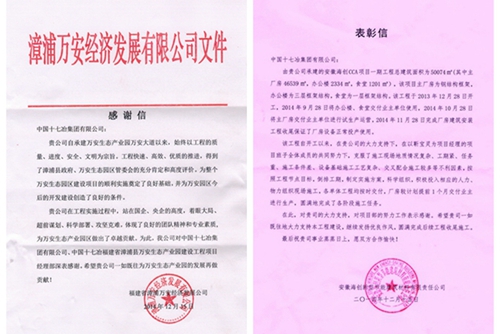 日前,福建省漳浦万安经济发展有限公司和安徽海创新型节能建筑材料有限责任公司向中国十七冶集团发来感谢信,感谢中国十七冶集团交通工程技术公司福建万安大道项目经理部为万安生态产业园区建设做出的重要贡献;表彰城建工程技术公司芜湖江北新材CCA一期工程项目部,称赞项目部为业主单位提前一个月实现投产做出了贡献。