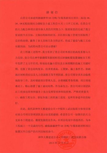 神华大雁建设公司·中煤科工武汉院联合体在发来热情洋溢感谢信的同时,希望我公司一如既往的大力支持该工程建设,继续发扬优良作风,在项目收尾阶段再接再厉,为该工程画上一个圆满的句号。