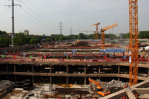 该项目的施工难点是双层地下室和多层支护内支撑,最大的困难是场地十分狭小,土方挖运受制因素多,加上青奥会、公祭日、PM2.5超标管控的停工影响,工期延误多。项目部进场以来,积极践行“24小时工作法”,主动协调各界关系,创造一切条件抢抓施工进度。到目前为止,共挖土27万立方,绑扎钢筋2600吨,浇筑混凝土16000立方。总体施工进度正按照重新审定的总网络计划有序推进。