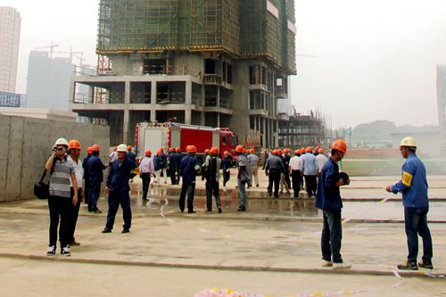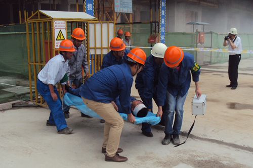 公司对此次应急救援演练事先做出了精心策划和细致安排。下午3时,总指挥、公司安监部部长做演练动员并发出演练开始指令。两名施工人员模拟报告在建施工的7#楼6层悬挑脚手架外安全防护立网起火火警,项目经理即刻启动突发事故应急处救援预案,现场迅速进入紧张而有序的应急救援氛围,抢险救援小组同时展开警戒隔离、人员疏散和干粉灭火器灭火。3时08分,现场高呼有人触电,救援人员立即以方木挑开电源线,关闭电闸,以担架转移触电人员并及时实施检查、包扎、抢救,救援车及时跟进载受伤人员到医院救治。