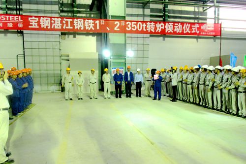 宝钢广东湛江钢铁基地项目炼钢工程设计年产钢水892.8万吨,优化配置铁水预处理、转炉炼钢、精炼主体冶炼设施以及与之相配套的公辅设施,配置独立设置铁水预处理中心,两个铁水倒罐坑,机械搅拌脱硫装置3套,预留1套,配置公称容量350t复吹转炉3座,单工位RH2套,LATS2套,双工位LF1套,均离线布置。本次倾动的转炉为目前我国国内出钢量最大的转炉,自2015年2月2日转炉就位以来,全体参战员工充分发扬“高效严谨、精细务实”的企业作风,以“一天也不耽误、一天也不懈怠”的中冶精神,克服气候炎热、设备供货慢等多方面困难,积极践行“24小时工作法”,兑现“决战3、4、5,确保转炉倾动”的重大节点承诺,为宝钢湛江炼钢工程“15.9”节点的顺利实现奠定了坚实的基础。