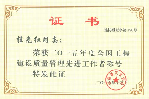 近日,中冶置业(安徽)公司总工程师、副总经理桂光红收到中国建筑业协会颁发的“2015年度全国工程建设质量管理先进工作者”荣誉证书。