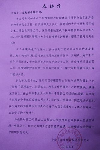 4月1日,含山县城市投资建设有限公司向中国十七冶集团发来表扬信,对中国十七冶集团房屋工程技术公司含山公租房项目部诚信卓越、艰苦奋斗、顾全大局的工作作风给予表扬。