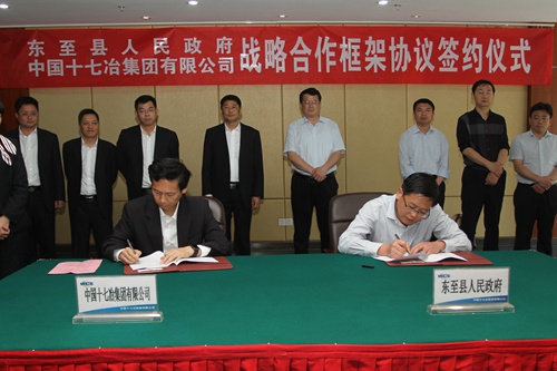 5月16日上午,中国十七冶集团与安徽东至县人民政府在公司总部签订战略合作框架协议。东至县委书记孙革新与中国十七冶集团董事长、党委书记喻世功出席签约仪式并致辞,中国十七冶集团总工程师、副总经理尹万云与东至县副县长周美超代表双方签署战略合作框架协议。