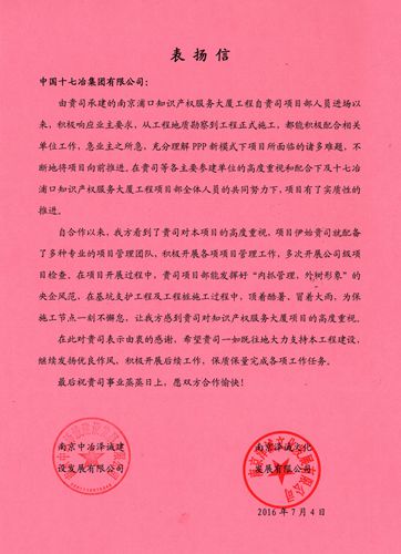 日前,南京市浦口区国有资产投资经营有限公司向中国十七冶集团发来表扬信,表扬工业建筑工程技术分公司在浦口知识产权服务大厦项目努力克服PPP新模式下各种难题,积极响应业主要求,不断将项目向前推进的优秀表现。