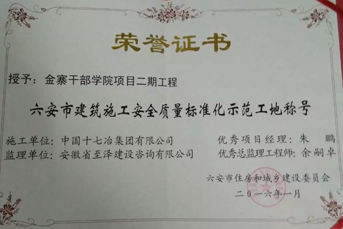 日前,由中国十七冶集团房屋工程技术公司承建的金寨干部学院项目二期工程被六安市住房和城乡建设委员会授予“六安市建筑施工安全质量标准化示范工地”称号。