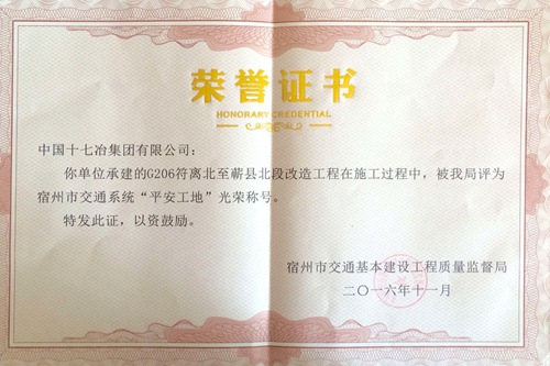11月11日,从宿州市交通基本建设工程质量监督局传来喜讯,由中国十七冶集团路桥工程技术公司承建的宿州G206符离北至蕲县北段改造工程项目荣获宿州市交通系统“平安工地”光荣称号,进一步树立了公司在宿州市场的良好形象。
