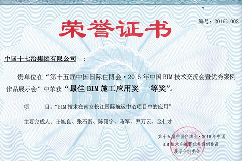 10月15号,由中国建造师联盟主办的第十五届中国住博会·2016年中国BIM技术交流暨优秀案例作品展示会大赛在京召开,中国十七冶集团报送的“BIM技术在南京长江国际航运中心项目中的应用”项目荣获“最佳BIM施工应用奖一等奖”。