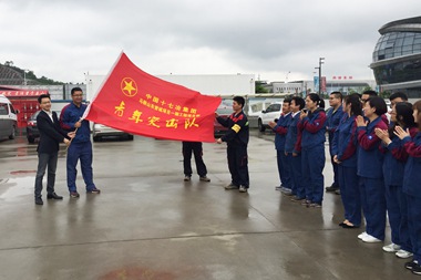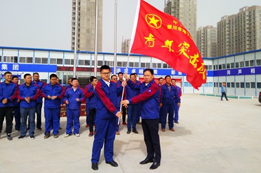 授旗仪式主会场队列整齐,团旗飘扬,庄严朴素。共青团马鞍山市委书记钱俊向中国十七冶集团南京浦口巩固8号地块保障房工程项目经理部青年突击队授旗。青年突击队队长吴昌勇代表全体突击队员向公司青年员工发起了《让青春在十七冶发展的伟大征程中飞扬》的倡议书。