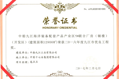 2月23日获悉,由中国十七冶集团江西分公司承建的中船九江海洋装备配套产品产业区1#联合厂房(辅楼)工程荣获2016年度九江市优良工程奖。