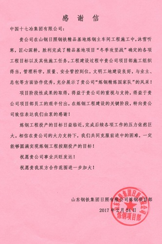 2月27日,山东钢铁集团日照有限公司炼钢项目部向中国十七冶集团有限公司致表扬信,感谢冶金工程技术公司在其承建的山钢日照钢铁精品基地炼钢主车间工程施工中的优良表现。