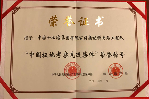4月24日,在北京召开中国极地考察表彰大会上,由外交部副部长刘振民宣读国务院李克强总理批示,人力资源社会保障部、国家海洋局授于中国十七冶南极科考站工程队“中国极地考察先进集体”荣誉称号,国家海洋局副局长房建孟为获奖者颁发奖牌。国家海洋局长王宏以及国家相关部委、局等领导出席了表彰大会。