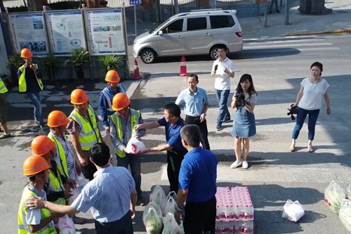 在人民路施工现场,刘三民区长为在高温酷暑中奋战在管廊施工现场的员工送来了西瓜、绿豆、白糖、矿泉水、毛巾等防暑降温物品,并与一线员工亲切握手,认真了解了员工福利、工作时间等情况,并通过他们向全区参与建设的工作者致敬。西安市临潼区当前正处在酷暑期,针对工作压力重、工作时间长等实际情况,刘三民区长强调,要坚持以人为本,严格落实防暑降温措施,保证高温条件下员工的身心健康,以更好的工作状态投入到工作中去,共同将城市建设得更加美好。