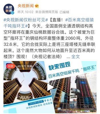 111日项目提升合拢当日,央视新闻在APP、微博等多个新媒体平台对项目升顶合拢盛况进行了直播,全程吸引了三百多万人次观看,进一步提高了中冶品牌宣传的覆盖面,有效增强了宣传的渗透力和影响力。在多机位、多角度直播镜头和延时摄影、航拍、三维特效等震撼画面的助力下,主持人深入项目现场,访谈参与此次吊装提升的亲历者,从而以沉浸、互动的视角展示了本项工程在施工、技术等方面的特色。