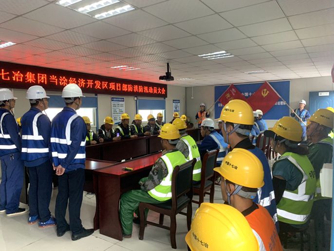 连日来,连续强降雨侵袭了长江流域,一轮洪峰倾泻而下,马鞍山市当涂县主要河流水位不断上涨,当涂县政府启动一级防汛应急响应,防汛工作形势异常严峻。“就算把群里消息翻看多少遍,都比不上踏在园区的大地上来的的安定。”作为抗洪防汛组长的李忠明刚结束雄安新区项目的工作,在自身伤病没有痊愈的情况下,马不停蹄转战到当涂项目,紧急召开抗洪抢险工作动员部署会,组建四支共计50人的抗洪抢险突击队,并为突击队授党旗及队旗;不歇片刻的跑遍县城收集物资编织袋2000余条、雨衣100余件,铁锹、救生衣等救援物资若干,组织挖机两台、抢险救援车辆四台,整装待命。