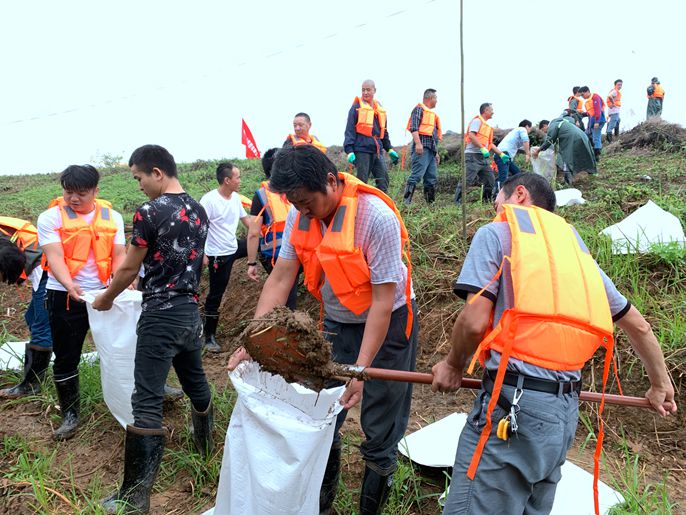 突击队分工合作装填土袋运上大堤
