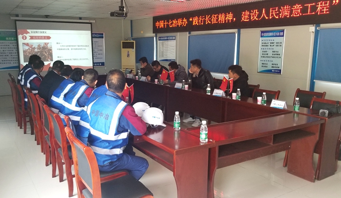 在学党史、悟思想环节,项目党支部组织全体党员观看了纪录片《长征》,回顾历史,展望未来,学习老一辈无产阶级革命家身上艰苦奋斗、大公无私的优秀品德。项目党支部委员周鹏讲党课《长征精神》,主要讲述长征的背景和意义、长征过程中的感人事迹及弘扬的红色精神、新时代的长征精神对现在的我们的指导意义。党课结束后,项目全体党员在党旗下重温入党誓词、回想入党的初心,表示要积极践行长征精神,建设人民满意工程。
