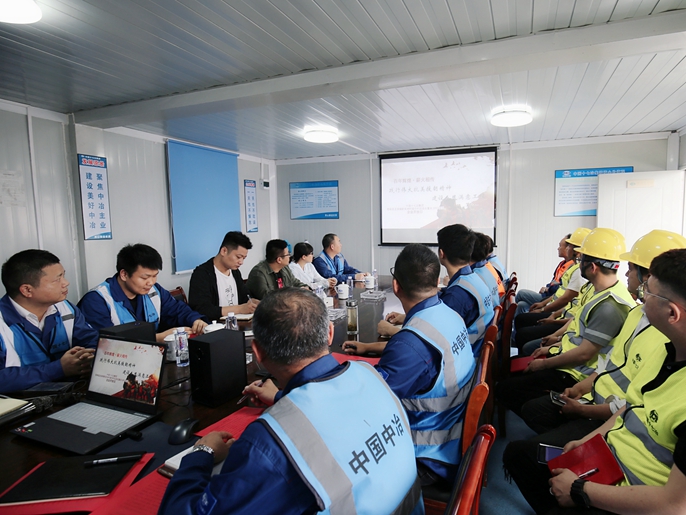 项目经理介绍了在项目施工过程中如何发扬“抗美援朝精神”,项目所面对的技术难题、项目的工程亮点以及取得的优异成绩,使大家对项目有了更加深入的了解。之后项目部党支部书记介绍了项目在当地践行央企社会责任及党建工作开展等一系列情况。党支部通过充分发挥战斗堡垒作用和党员的先锋模范作用,将“抗美援朝精神”落到实处,全力冲刺赶工期,展现党员干部“干在实处、走在前列”风采。