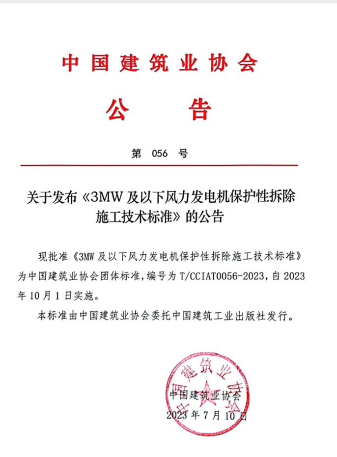 近日,从中国建筑业协会获悉,中国十七冶建安分公司主编的《3MW及以下风力发电机保护性拆除施工技术标准》通过中国建筑业协会团体标准审核,正式发布,自2023年10月1日起实施。