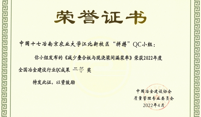 项目团队已申报专利33项,其中发明专利19项(授权1项)、实用新型专利14项(授权11项),省部级QC成果二等奖1项,市级QC成果8项,BIM技术获奖6项。项目部以“一次成优”的理念,全过程的质量管理,获“南京市优质结构”“江苏省建筑施工标准化星级工地”等荣誉,为项目创省优、国优目标走出坚实的一步。