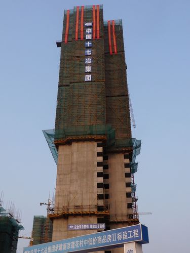 722上午918分,十七冶南京河西莲花中低价商品房A04栋主体工程结构封顶。