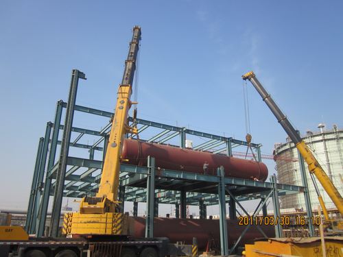 本次安装的4#蓄热器属国内目前同类中较大的设备,其长24m,直径为3.2m,单重130t,位于▽8.400m平台上。为确保顺利吊装,项目部编制了专项技术方案,并通过了集团公司专家及外部专家的严格评审,施工采用2250t汽车吊进行抬吊,各环节均按方案有序地进行。至此,梅钢炼钢二期公辅工程4台蓄热器全部安装就位。