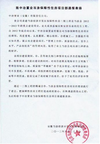 日前,安徽当涂经济开发区管委会向中冶置业(安徽)公司发来表扬信,通报表扬当涂保障性住房项目部。