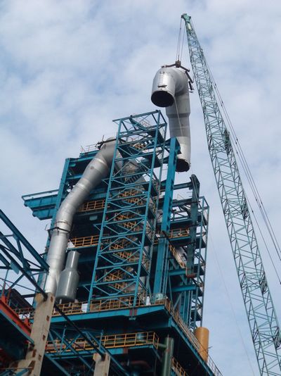 联峰钢铁3#1080m3高炉工程上升管顶部三通管顺利吊装