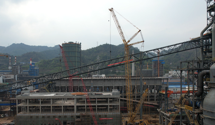 本项目位于福建省三明市三钢厂区内,冶金分公司承建1#、2#高炉主体,包含矿焦槽及上料、高炉本体、炉顶、均压煤气全回收、出铁场、粗煤气、渣处理、水处理、通风除尘等系统的土建施工、材料供货及制作安装、机电设备安装及调试、缺陷责任保修服务等。减量置换投产后,两座高炉产能可达331.8万吨/年,装备水平及主要技术经济指标将达到国内先进水平。此次吊装的通廊A3段标高为32.5-50.5米,角度11.936度,长83.6米,宽5.5米,高6.133米,总重157吨,该段通廊在中控楼与旧通廊狭窄空间中拼装,在通廊上部设置B型加强吊耳,采用500吨履带吊和280吨履带吊双机抬吊方式安装。